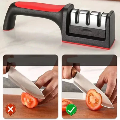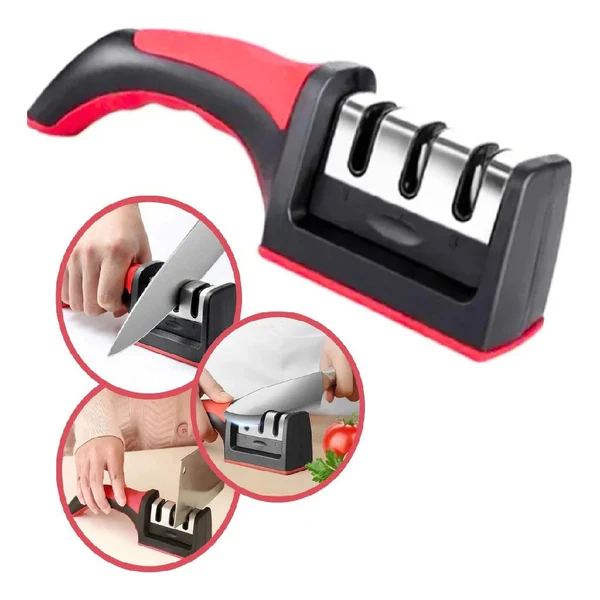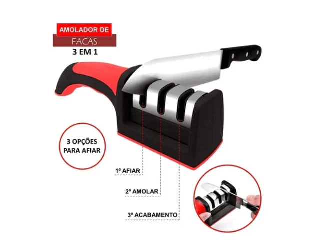 - Recursos : 3 estágios de afiação (grosso, médio, fino), cabo ergonômico, compatível com vários tipos de facas